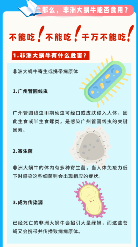 非洲大蜗牛身上携带多种细菌,人们用手触摸,会引起皮炎、皮肤瘙痒、肿胀等。