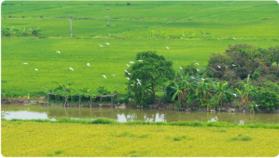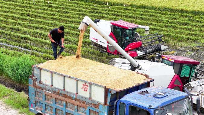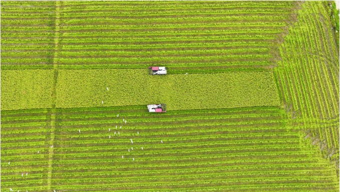 伴随收割机作业的,还有一群群白鹭。它们紧跟收割机啄食昆虫,共同描绘出一幅生动鲜活的丰收景象。