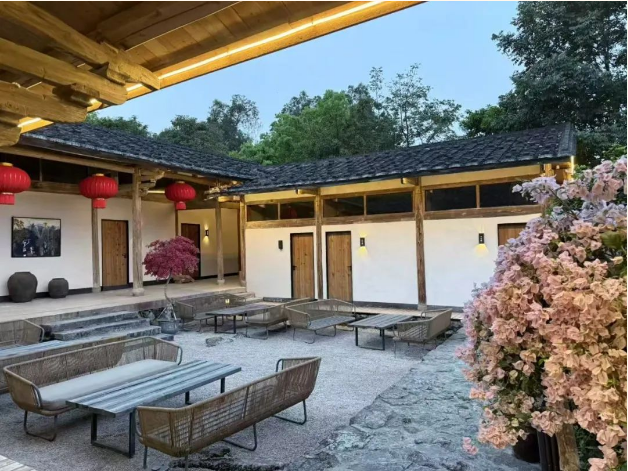 “让城市人享受乡村美好,才是真正的民宿。”林情在庭院留出开阔空间,大草坪供孩童奔跑,石阶小径通向茶室,露天电影院旁砌了面包窑。最受欢迎的是废弃粮仓改造成的石屋咖啡厅——斑驳土墙与意式咖啡机并存,成为游客打卡点。